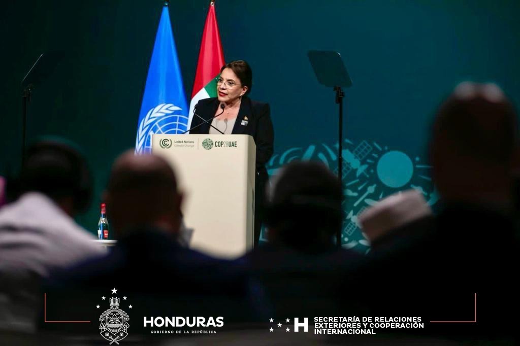 En el marco de la COP28, Honduras asumió un papel protagónico como presidenta pro tempore de la Coalición de Países con Bosques Tropicales, defendiendo la protección de los bosques tropicales ante jefes de Estado, organismos multilaterales y promotores de políticas globales de mitigación del cambio climático.
