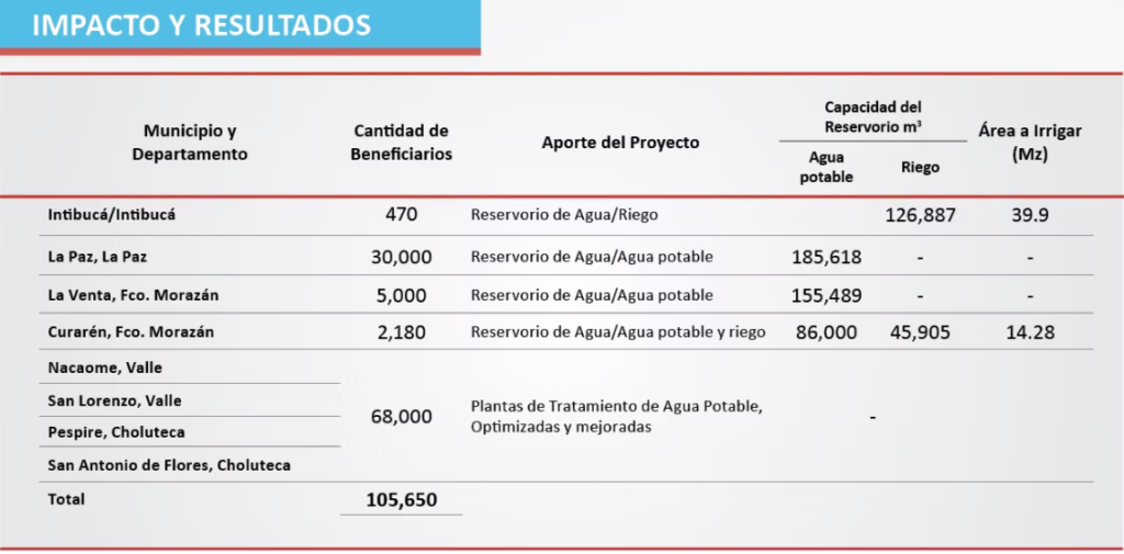 Comunidades de Curarén, La Venta, La Paz, Intibucá, Nacaome, San Lorenzo, Pespire y San Antonio de Flores, muchas de ellas históricamente sin acceso al servicio, se verán beneficiadas con agua potable, saneamiento, riego agrícola y energía limpia, reduciendo su vulnerabilidad ante sequías e inundaciones.